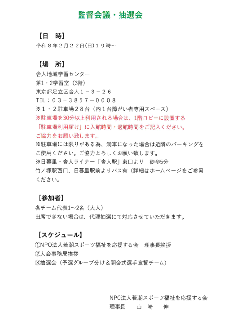 以前ご連絡しておりました、監督会議・抽選会ですが